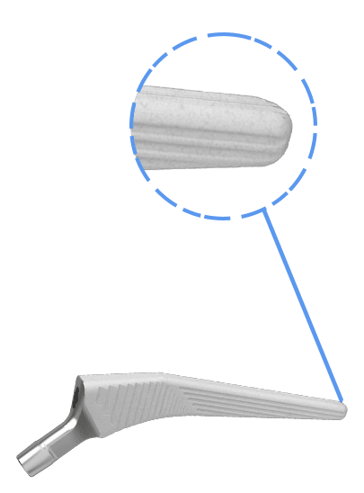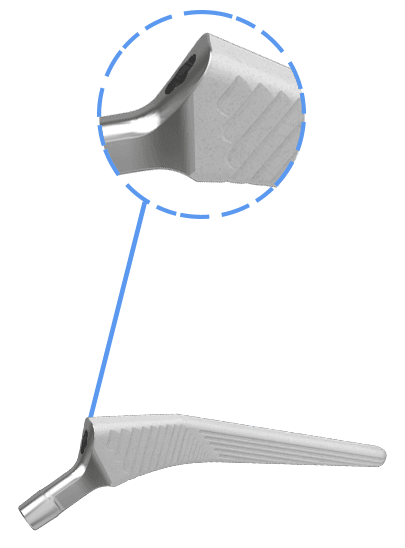 Бесцементный бедренный компонент имеет как вертикальные, так и горизонтальные насечки для обеспечения вращательной и осевой стабильности.